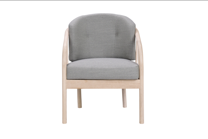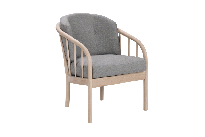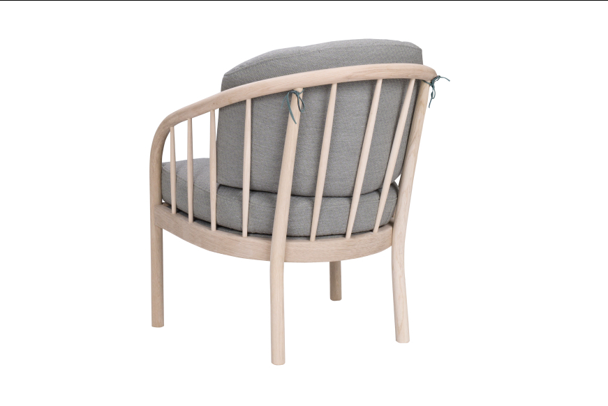 På billedet ses en Maria stol i ubehandlet egetræ og med lysegråt Misha uld betræk.
