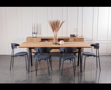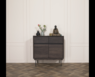 AKUSTIK HIGHBOARD fra Kristensen & Kristensen er designet med ønske om at forbedre akustikken i boligen samt opretholde et pænt udtryk. Kombinationen af trælameller og filt, er ikke blot tænkt ind i designet for at fornøje øjet, men i lige så høj grad for at absorbere rumklang. Highboardet er vist her i massiv mørk grå olieret ask med sort metal sokkel.