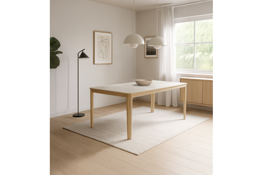 SM 31 Spisebord i massiv hvidolieret egetræs stel med grigio laminat bordplader.
