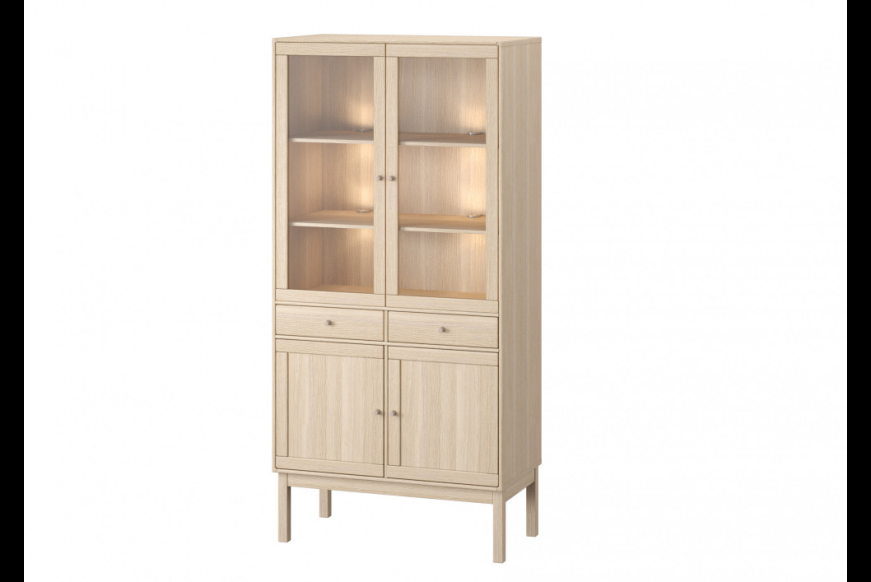 Rimme vitrine er fuld af funktionelle opbevaringsløsninger. I toppen er to elegante glaslåger. Bag hver glaslåge er 2 mindre træhylder, der er ideelle til synlig opbevaring af glas, porcelæn eller dekorative genstande. Alle de synlige hylder er forberedt til lys, som kan tilkøbes, hvilket giver en smuk ramme for de udstillede genstande.