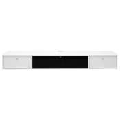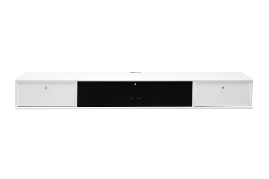 Let og elegant tv møbel i snehvid. Med stof klap i sort, som lyd og signal let går igennem. Samt 2 stk. skuffer.