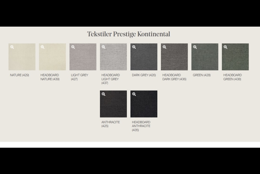 Jensen Prestige har et moderne design, og leveres i eksklusive møbeltekstiler fra Beaulieu i farverne natur, beige, dark blue, grey og anthracite. Der findes også matchende designtekstiler til hovedgærdet. Jensen Prestige har dobbelte sømme med et diskret broderet logo på den nederste kant af sengen.