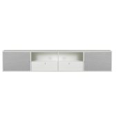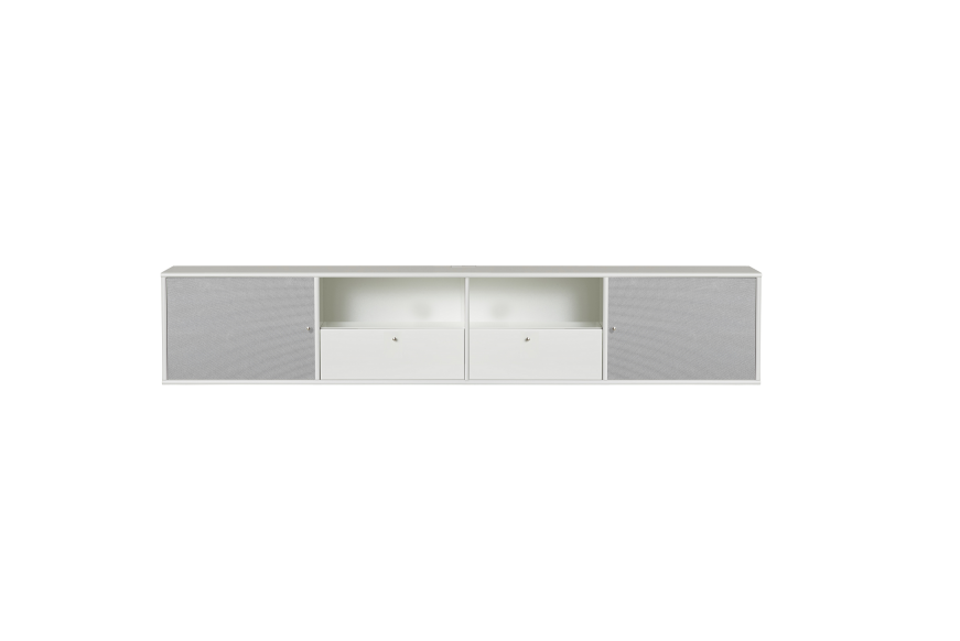 Let og elegant snehvidlakeret tv møbel med stoflåger i sølvfarvet, som lyd og signal let går igennem
