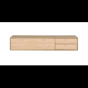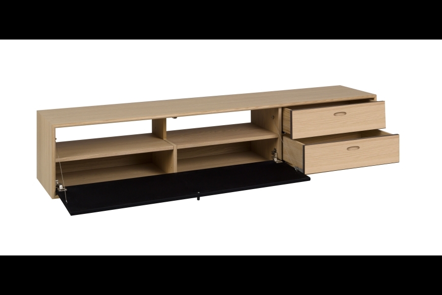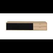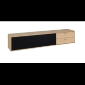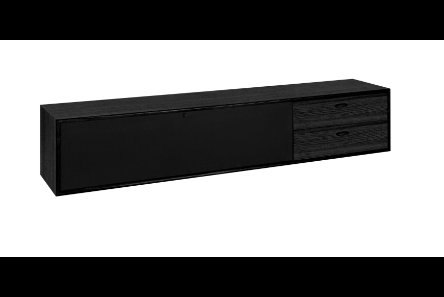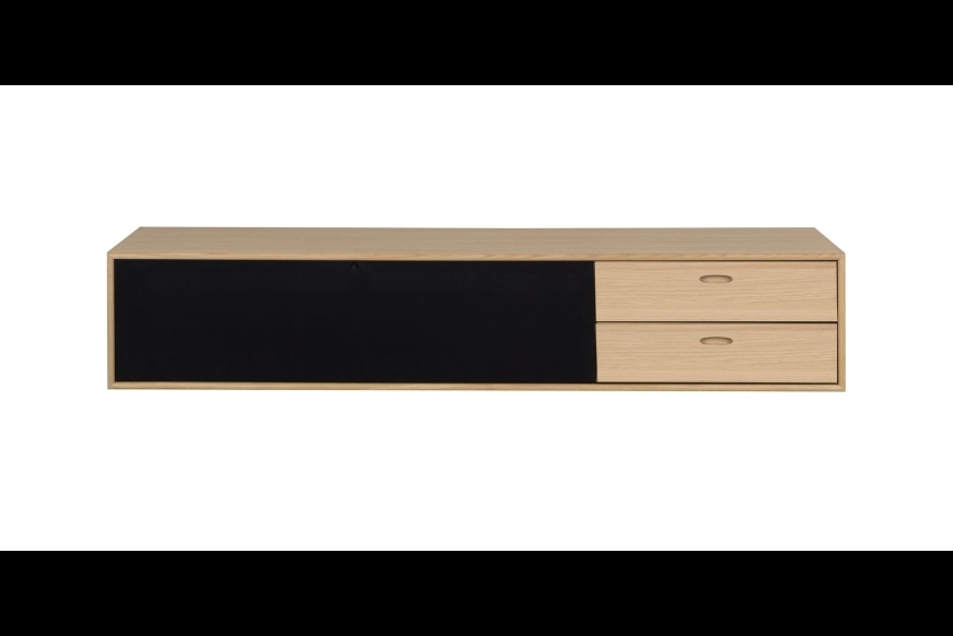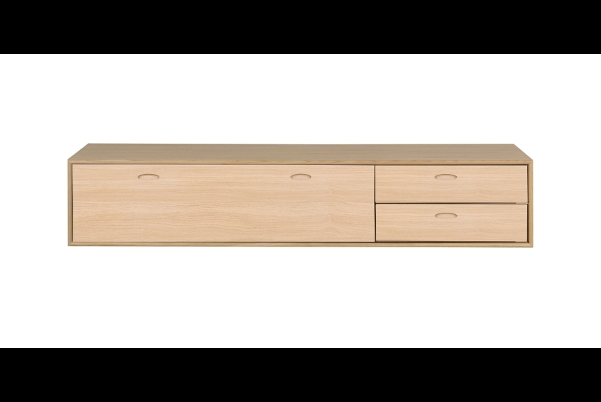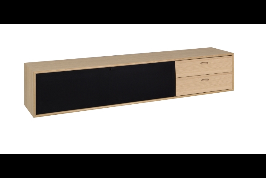 Mediemøbel med 1 stofklap eller træklap og 2 skuffer. Kabinettet har elegante geringssamlinger på hjørner og afrundet forkant. Inkl. vægophæng - understel i træ eller metal kan bestille separat - spørg gerne og vi finder den løsning, som passer bedst hjemme hos dig.