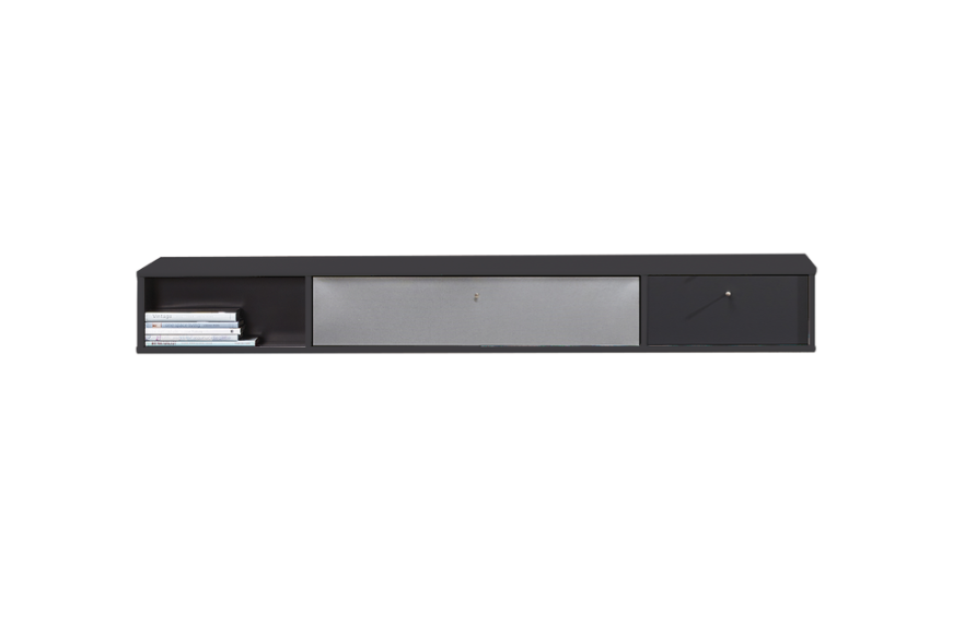Let og elegant tv møbel i antracit. Med stof klap i sølv, som lyd og signal let går igennem. Samt skuffe.